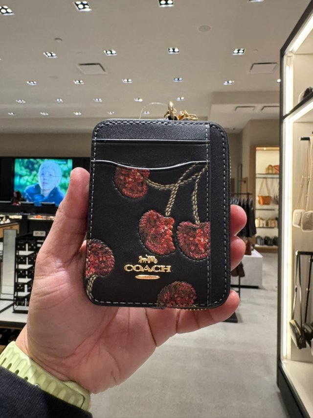 Coach 櫻桃印花拉鏈匙扣卡包 Mini Skinny Id Case With Cherry Print (黑 Black)