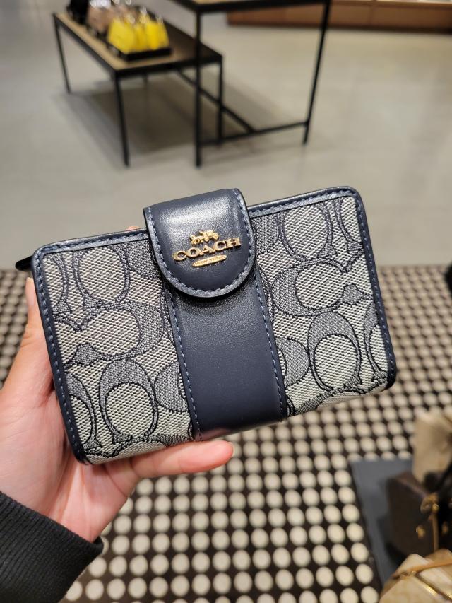 Coach Medium Corner Zip Wallet In Signature Jacquard (Maple/ Navy)