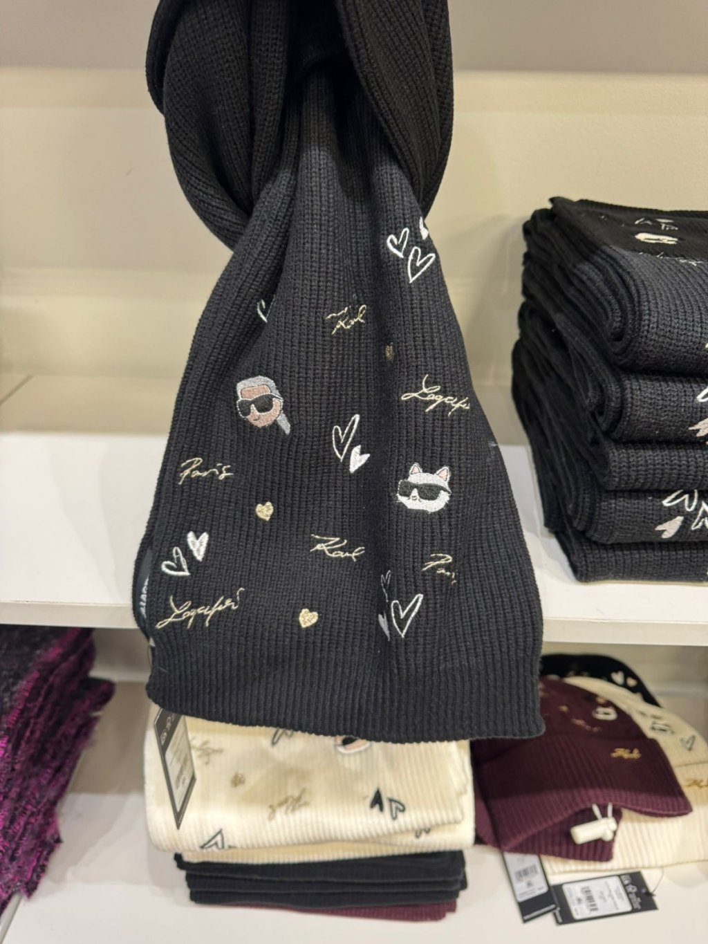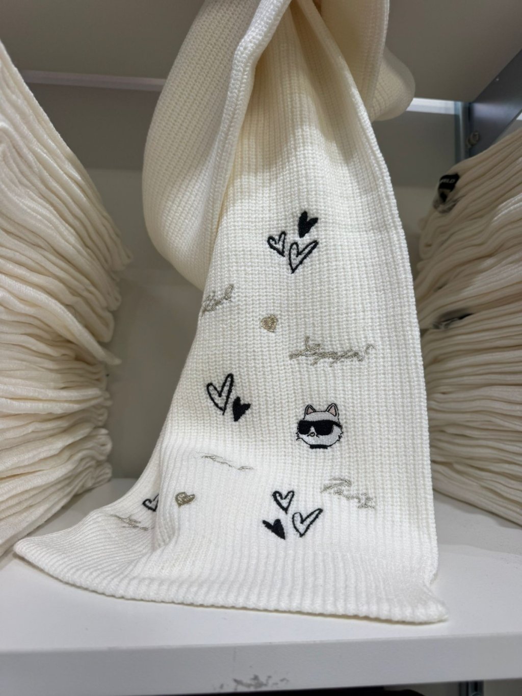 Shaker stitch knit scarf, ribbed ends, multi-colored Karl hearts embroidery