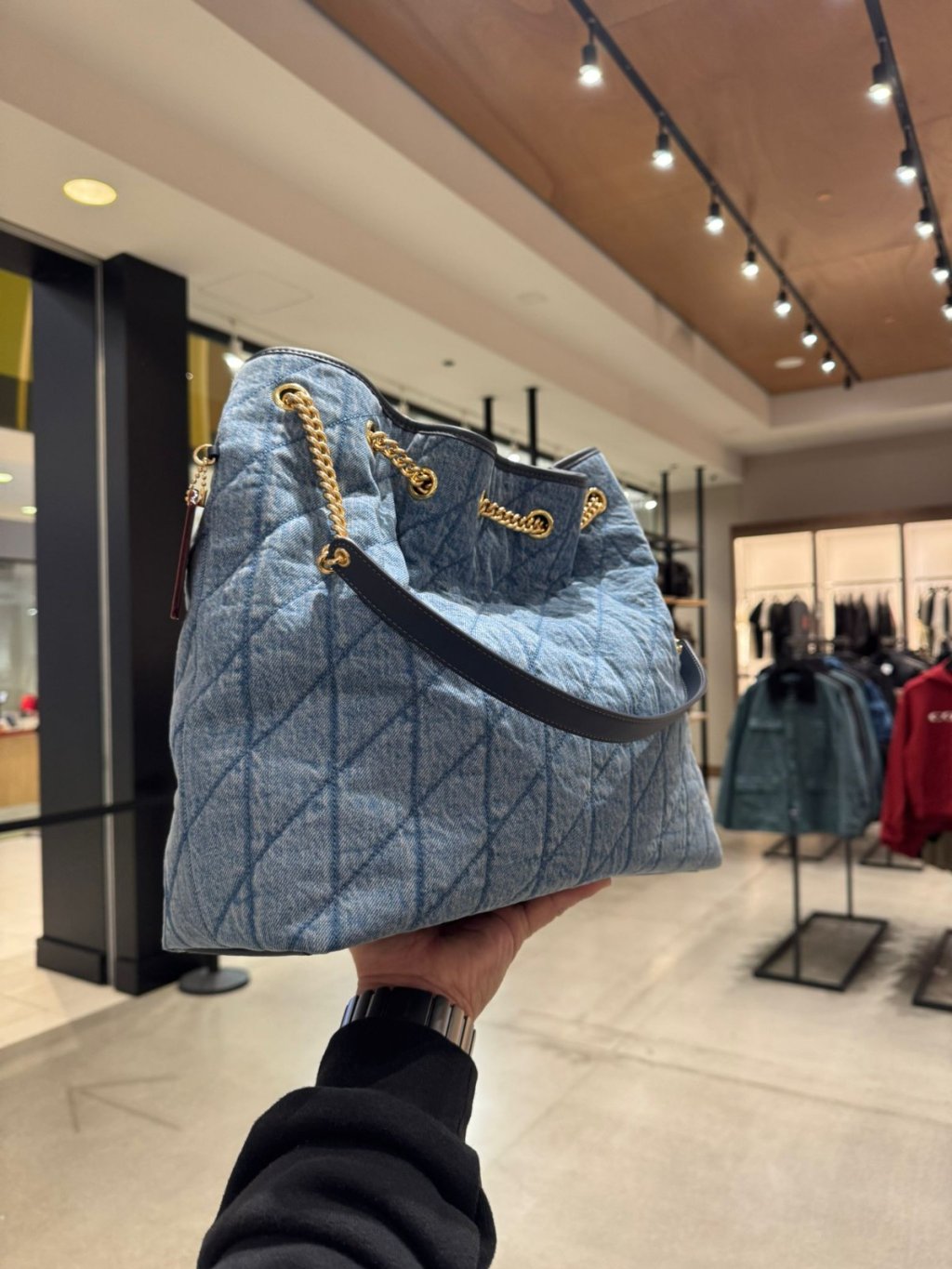 Coach Evelyn 牛仔大垃圾袋 Large Shoulder Bag In Regenerative Cotton With Quilting