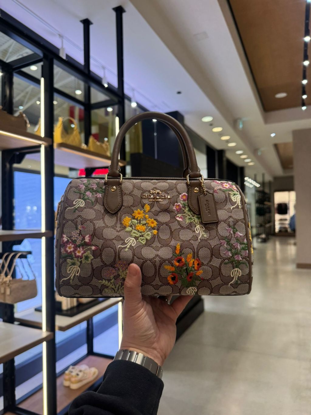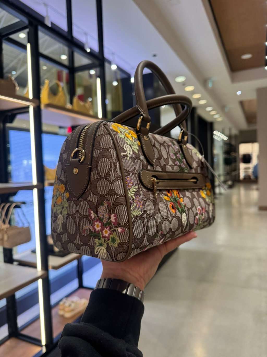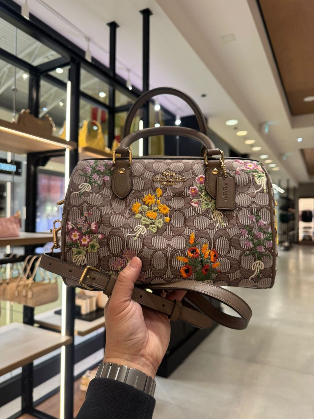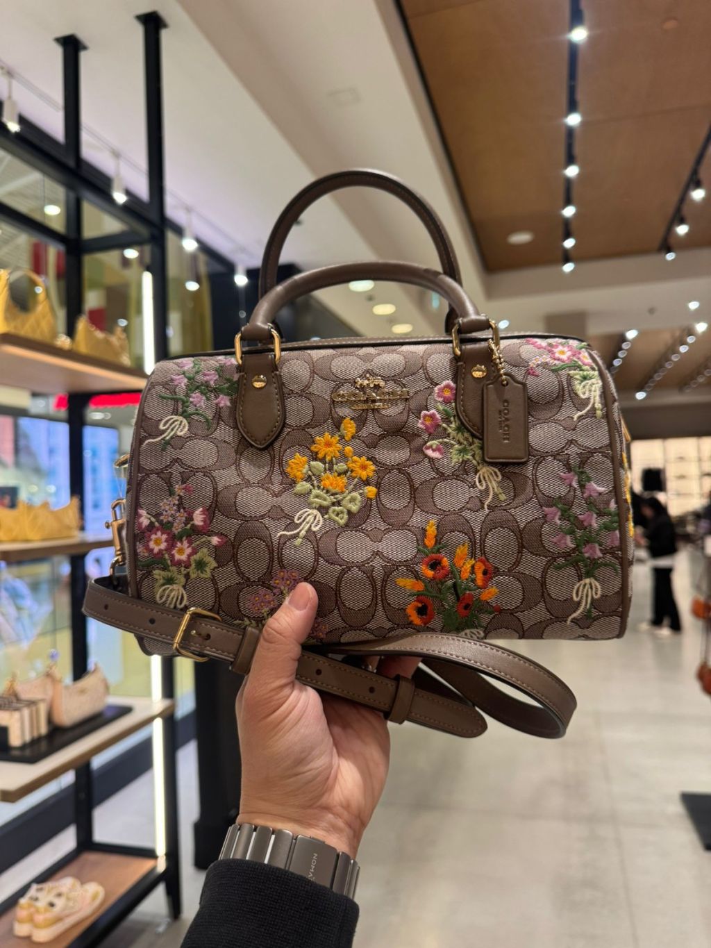 Coach Rowan 繡花中波士頓 Satchel Bag In Signature Jacquard With Floral Embroidery