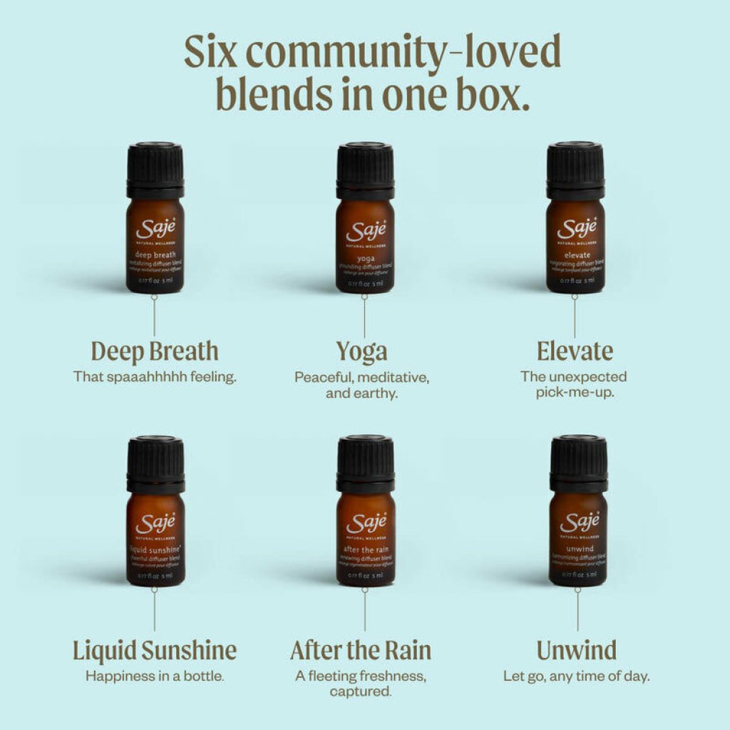 This kit includes six of our best-selling blends to enhance your atmosphere and help you create a personalized scent experience in your home. Best of Saje showcases well-loved favorites for both daytime and nighttime, offering a variety of aromas to suit any preference.\